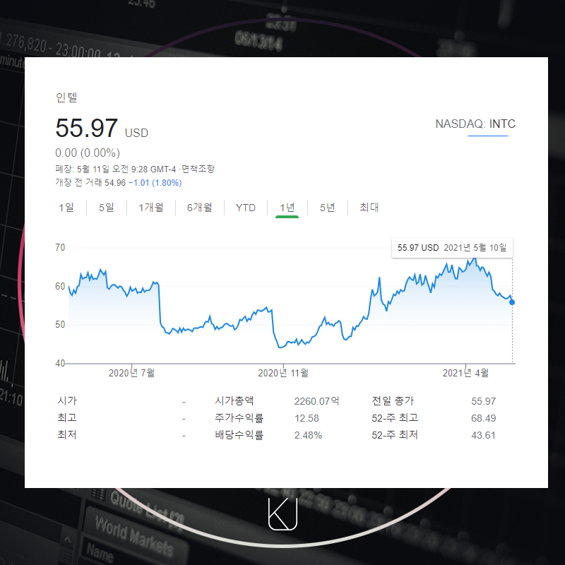 오늘은 기존과 다르게 주식을 비추천하는 이야기다. 대망의 주인공은 인텔 코퍼레이션이 되겠다. 세계 최대 반도체 회사이고, 실적도 좋게 나왔는데, 주식은 떨어지는 신기한 주식이었다. 나는 인텔 주식이 저렴하다는 생각에 구매했었다. 많은 주식을 구매한 건 아니었지만, 해외 주식을 시작한 초장기였고, 인텔은 내 주식포트폴리오에서 높은 비중을 차지하고 있었다. 보안 문제가 크게 터졌다는 것도 알고 있었고, 전직 CEO가 이상하다는 것도 알고 있었다. 그래도 구매한 이유는 인텔이라는 이름이 가지는 브랜드 때문이었다. AMD가 아무리 성장을 했다고 해도, 내 기억 속의 AMD는 언제나 불안한 CPU였고, 그 결과 컴퓨터를 구매할 때마다 이 세상에 CPU 생산업체는 하나인 것처럼 인텔 CPU를 구매하였다.(맥에도 인텔 CPU가 들어갔다.) AMD 주가가 높은 건 단지 자율주행차와 그래픽카드 때문이라는 생각과 함께 말이다. 결코, 나만의 생각은 아닐 것이다. 그리고 인텔의 퀵싱크 기술을 높게 평가하고 있었다. 거기다 인텔은 AMD 시총의 2배다.