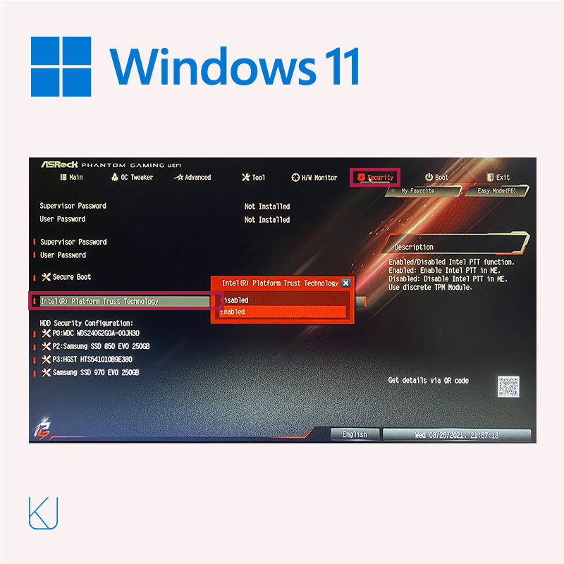 Asrock 보드의 TPM은 바이오스 진입후 Advaced Mode로 들어간 후 상단 메뉴의 security를 선택 후, 하단 메뉴에서 Intel(r) plaform Trust Technology를 비활성화해주면 됩니다. 옆에 설명을 보고 알았는데, Enabled/Disabled Intel PTT function. Enab led: Enable Intel PTT in me, Disabled : Disable Intel PTT in me, Use discreate TPM Module. 인텔 CPU를 사용하고 있다면, 인텔 PTT를 비활성화 하고 TPM 모듈을 사용하게 해야 하므로, Intel(r) plaform Trust Technology를 비활성 하여 윈도우 11를 설치하시면 됩니다. 끝.