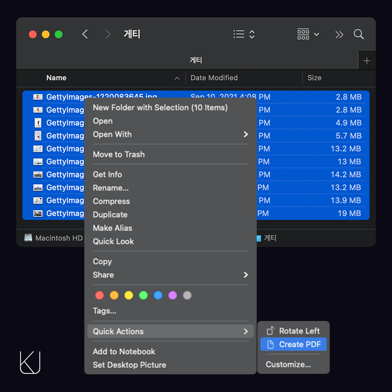 추가 프로그램은 필요 없습니다. 파인더만 있으면 됩니다. 자신이 합치기 원하는 PDF 파일 및 이미지 파일을 선택합니다. 오른쪽 클릭 > quick actions(빠른 작업) > Create PDF (PDF 만들기)를 선택하면 됩니다.