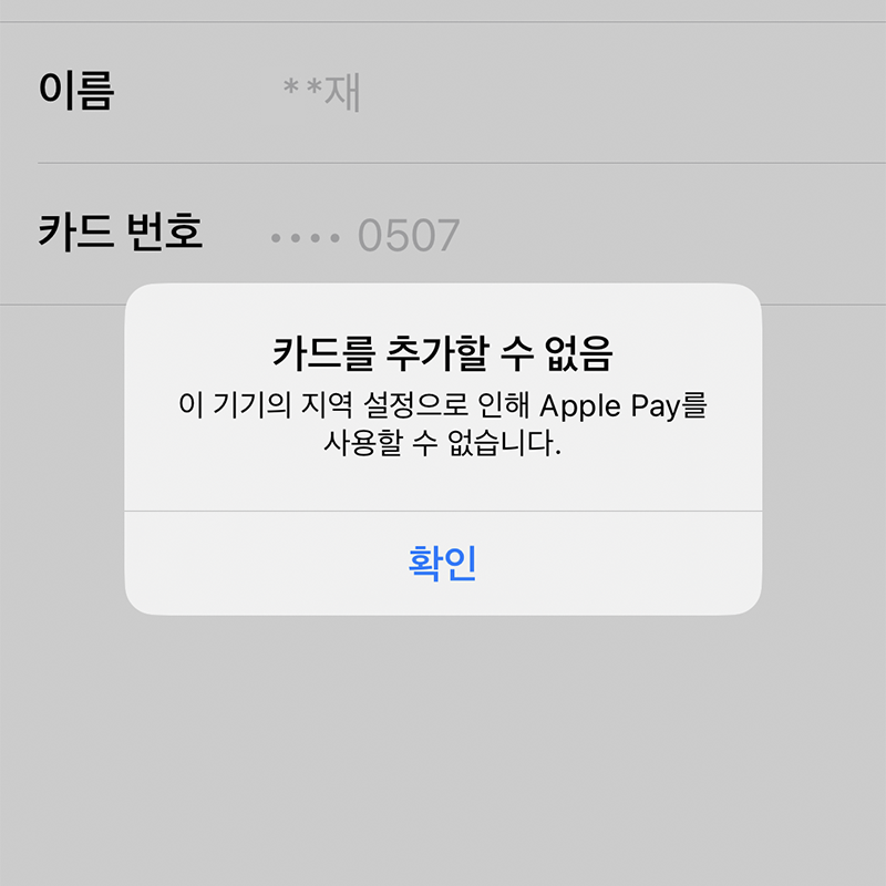 이 기기의 지역 설정으로 인해 Apple Pay를 사용할 수 없습니다. 해결방법