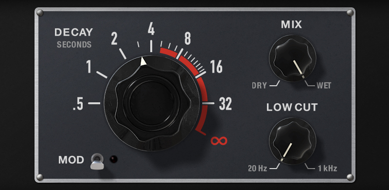 DECAY는 잔향의 길이를 설정하는 것이다. EMT 140 아날로그 플레이트는 5초의 제한이 있었는데, Little Plate는 무한대로 설정이 가능하다는 걸 볼 수 있다. 밑에 있는 mod는 모듈레이션인데, 음의 피치를 조절하거나 타이밍의 변화를 줘서 조금 더 아날로그적인 느낌을 주기 위한 버튼이다. Mix는 원본 소스와 리버브 소스의 비율을 조정할 수 있다. Send 채널로 보통 리버브를 사용하기 때문에 100로 사용하였고, 소리에 직접적으로 인서트 플러그인으로 사용한다면 믹스량을 조절하면 된다. 마지막 기능으로 Low Cut으로 리버브의 저역과 보컬의 저역이 충돌하는 것을 방지하기 위해서 로우컷을 진행하는 것이 좋다.
