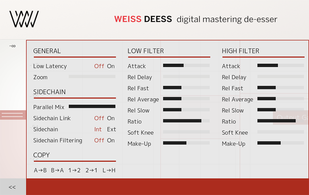 Weiss Deess는 디테일한 설정을 할 수 있는데, Mix 설정을 통해 원본과의 블렌딩 비율을 설정할 수 있다. Sidechain Link는 Sidechain를 ext로 설정했을 때, 각 채널이 독립적으로 처리되는지 여부를 설정할 수 있다. 저역과 고역 필터는 설정을 다르게 할 수 있다. attack으로 감쇄 시작 타이밍을 지정할 수 있고, rel delay는 RELEASE DELAY로 릴리되기 전 시간을 설정하면 된다. Rel fast, average, slow 는 릴리즈의 속도를 지정할 수 있고, ratio는 컴프레서에서 주로 보여지는 설정인데, 비율은 감쇄의 비율을 말하는데, 높은 값일수록 강하게 작동한다고 생각하면 편하다. Soft knee는 어느 정도 부드럽게 감쇄가 될 것인가를 설정하는 것이다. 값이 높을 수록 부드럽게 감쇄가 이루어진다. Make-up은 감소한 레벨을 보상해 주는 설정이다.