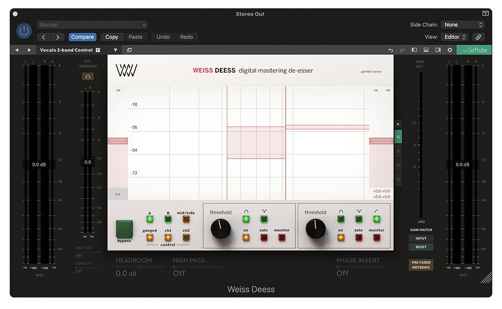 Weiss Deess는 일반 디에서보다 변화가 적은 디에서이다. 마스터링 디에서이니 당연하겠지만, 이 플러그인으로 Softube의 플러그인을 좋아하게 되었고, weiss MM-1 맥스마이저 마스터링 플러그인을 구매하게 된 플러그인이다. 디자인 깔끔하고, 설정도 디테일하다. 돋보이는 플러그인으로 고급 디에서(De-Esser)를 찾고 있다면 추천한다.