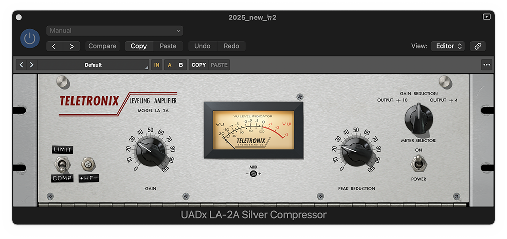 여성 보컬에 게는 LA-2A를 추천한다. UADx LA-2A를 사용했으며, 빠른 어택과 릴리즈로 피크를 관리할 때는 1176을 보컬 체인에 먼저 걸고, 뒤에 부드럽게 LA-2A로 따듯함을 추가하였다.